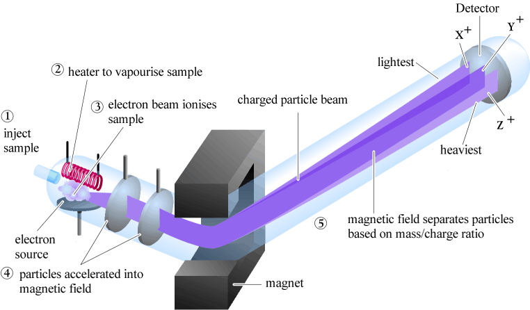 Cơ chế: Máy dò được duy trì trong môi trường chân không. Các hợp chất bị bắn phá bằng các điện tử (EI) hoặc các phân tử khí (CI). Hợp chất phân mảnh thành các ion hoặc mảnh tích điện đặc trưng. Các ion thu được được tập trung và tăng tốc vào một bộ lọc khối lượng. Bộ lọc khối lượng cho phép tất cả các ion có khối lượng cụ thể đi qua hệ số nhân điện tử một cách chọn lọc. Tất cả các ion có khối lượng riêng đều được phát hiện. Bộ lọc khối lượng sau đó cho phép khối lượng tiếp theo đi qua trong khi loại trừ tất cả các khối lượng khác. Bộ lọc khối lượng quét từng bước qua phạm vi khối lượng được chỉ định vài lần mỗi giây. Tổng số ion được đếm cho mỗi lần quét. Sự phong phú hoặc số lượng ion trên mỗi lần quét được vẽ biểu đồ dựa trên thời gian để thu được sắc ký đồ (được gọi là TIC). Một phổ khối lượng thu được cho mỗi lần quét, biểu thị các khối lượng ion khác nhau so với mức độ phong phú hoặc số lượng của chúng.