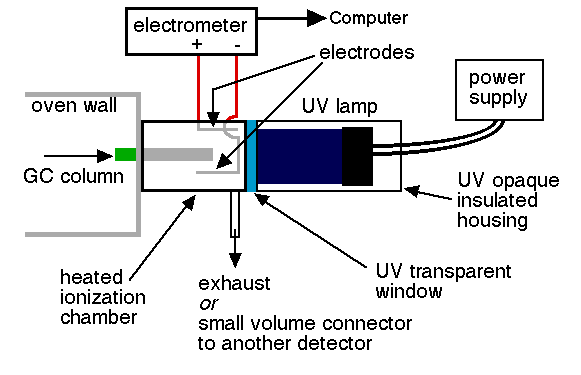 Cơ chế: Các hợp chất rửa giải vào tế bào bị bắn phá bằng các photon năng lượng cao phát ra từ đèn. Các hợp chất có thế ion hóa dưới năng lượng photon sẽ bị ion hóa. Các ion thu được bị hút vào một điện cực, được đo và một tín hiệu được tạo ra.