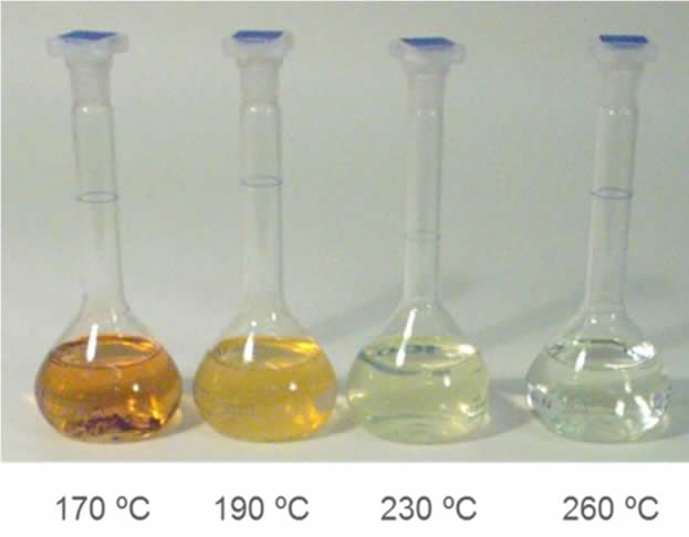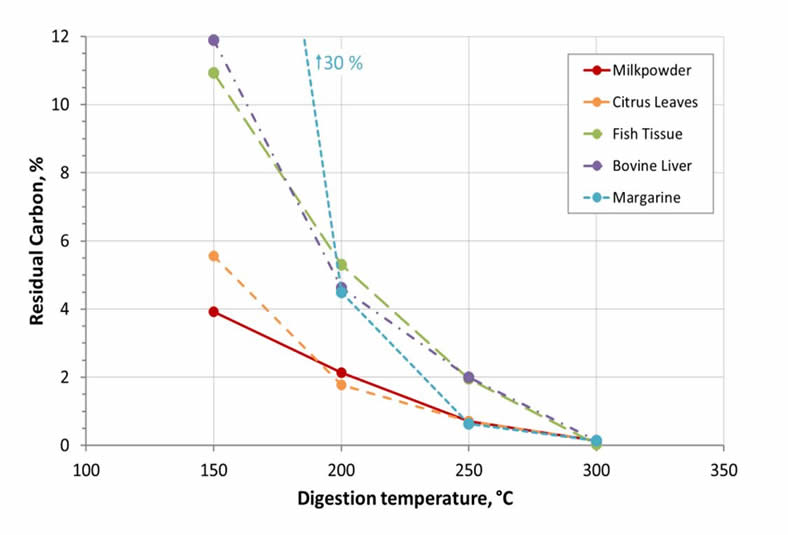 Không thể chỉ thay thế nhiệt độ phân hủy cao bằng cách tăng thời gian chạy ở nhiệt độ thấp hơn vì thiếu tiềm năng oxy hóa cao hơn. Điều này được thể hiện rõ trong Hình 4, trong đó cùng một lượng mẫu đã được phân hủy ở các nhiệt độ khác nhau nhưng cùng thời gian lưu giữ.