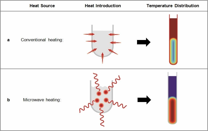 Với lò vi sóng, việc chuyển đổi năng lượng điện từ thành nhiệt năng hoạt động hiệu quả cao và dẫn đến tốc độ gia nhiệt cực nhanh – những tốc độ làm nóng này không thể tái tạo được với hệ thống làm nóng thông thường. Trong khi đun nóng thông thường, nhiệt phát ra từ bên ngoài và đi vào hỗn hợp phản ứng bằng dòng đối lưu (dẫn đến thành bình rất nóng), vi sóng đi qua thành bình (gần như) trong suốt vi sóng và làm nóng hỗn hợp phản ứng trên cơ sở phân tử. – tương tác trực tiếp với các phân tử.