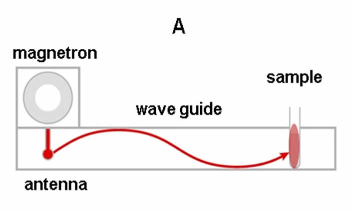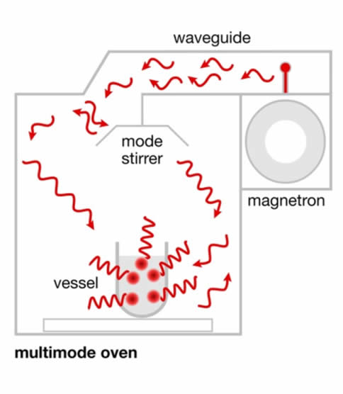 Một hoặc hai nam châm tạo ra bức xạ vi sóng, được dẫn vào khoang thông qua một ống dẫn sóng và được phân phối bởi một máy khuấy chế độ (xem Hình 6). Vi sóng được phản xạ từ các bức tường do đó tương tác với hỗn hợp phản ứng một cách ngẫu nhiên. Sự quay bổ sung của bình phản ứng trong khoang ngăn cản sự không đồng nhất về nhiệt độ và hình thành các điểm nóng.