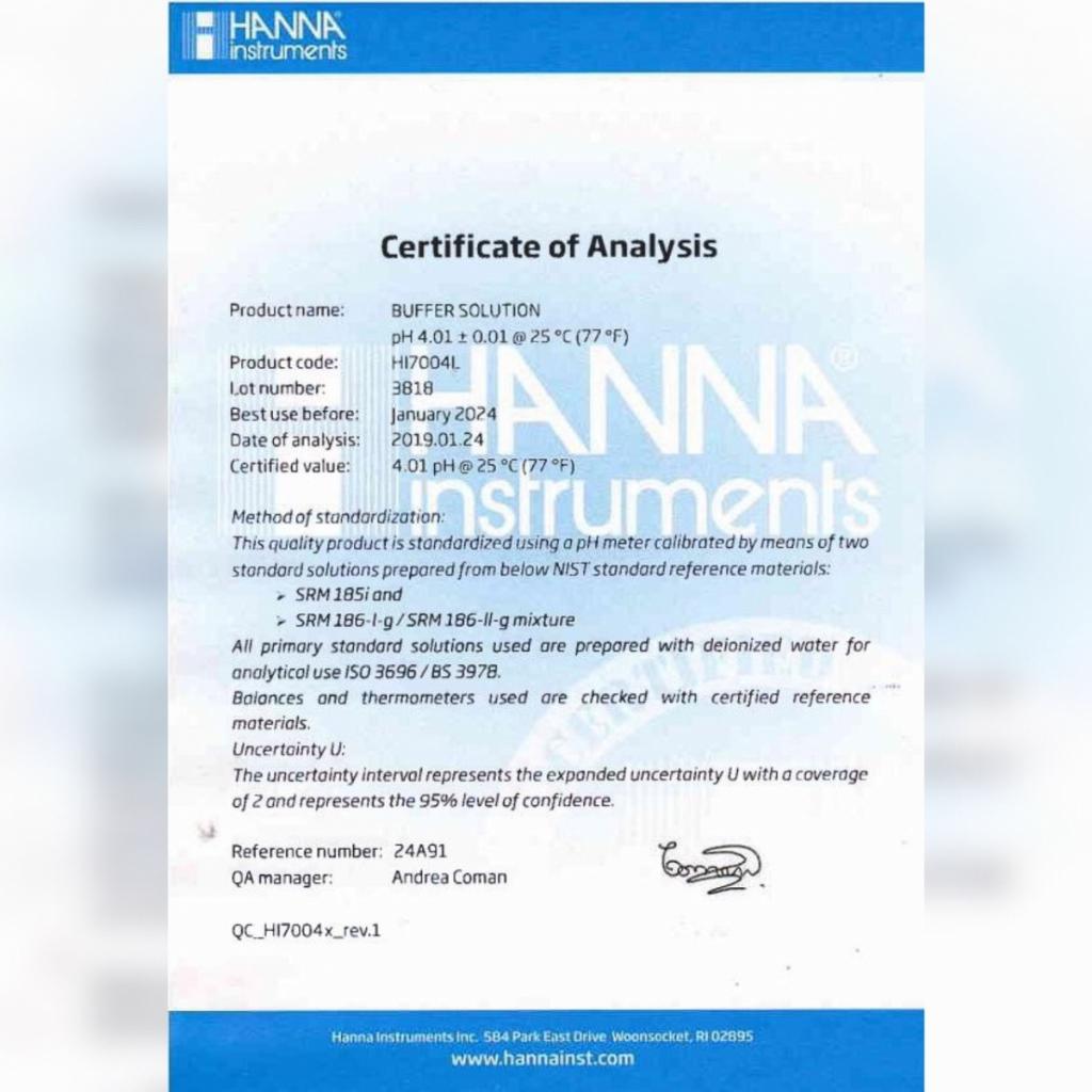 – Dung dịch chuẩn HANNA chất lượng cao được sản xuất tại nhà máy tiên tiến sử dụng hóa chất tinh khiết trong một môi trường kiểm soát nhiệt độ