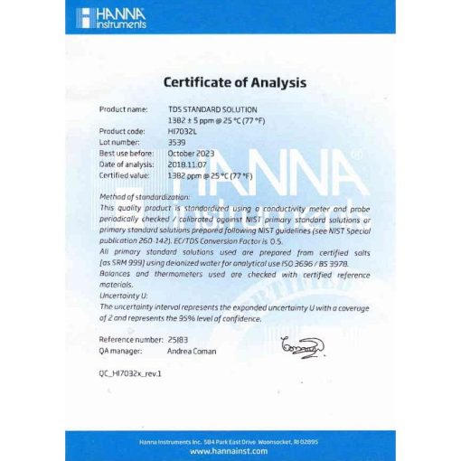 H7032L là một dung dịch hiệu chuẩn 1382 mg/L (ppm) chất lượng cao được chuẩn hóa cùng với một máy đo độ dẫn điện đã được hiệu chuẩn với kali clorua NIST SRM 2202 (Chất liệu tham chiếu tiêu chuẩn) trong nước khử ion dùng trong phân tích theo tiêu chuẩn ISO 3696 / BS3978.