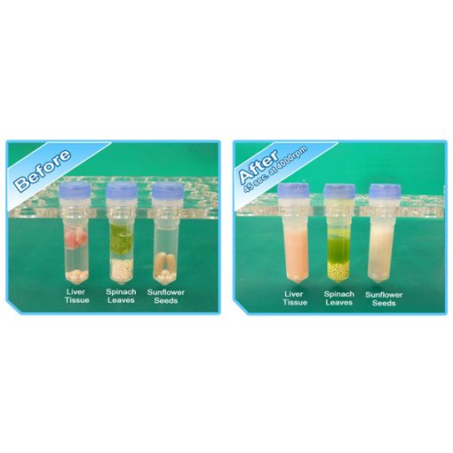 - Đồng nhất hóa tối đa 3 mẫu diễn ra đồng thời (thường trong vòng 45 giây) bên trong các ống vi mô có nắp vặn 2ml dùng một lần. Chuyển động trộn được tối ưu hóa gây ra sự phá vỡ tế bào nhanh chóng thông qua tác động tốc độ cao liên tục từ các hạt vi mô đã được làm cứng được chọn riêng cho loại mẫu của bạn.