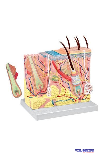 Mô hình giải phẫu da gồm 2 phần, phóng đại 70 lần kích thước thật. thể hiện cấu trúc da người 3 chiều,lông nang, tuyến bã nhờn,dây thần kinh và mạch máu.