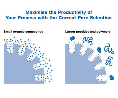 Để phân tách tối ưu, kích thước lỗ phải được điều chỉnh theo trọng lượng phân tử của mục tiêu. Với công cụ lựa chọn YMC, bạn có thể tìm thấy ngay kích thước lỗ phù hợp nhất chỉ trong nháy mắt, tùy thuộc vào kích thước của phân tử mục tiêu. Theo nguyên tắc chung, phân tử mục tiêu càng lớn thì kích thước lỗ của pha tĩnh càng lớn và độ kỵ nước của pha tĩnh càng ít. Tất nhiên, các giá trị này chỉ là khuyến nghị và các giới hạn là hướng dẫn. Do đó, việc thử nghiệm các kích thước lỗ khác nhau với tải trọng tăng lên là hợp lý.
